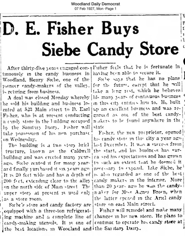 Theresa, I just Googled Fisher's Candy, Woodland, CA and some interesting articles came up. One was a newspaper article on Ancestry about a Fisher son from San Francisco, an excellent candy maker, coming back to his parents in 1906 or something. Also another article about the historical registry for Yolo County about 522-524 Main Street for Fisher's Candy from the late 1890's. Also a collection of photos of tile storefront markers that include some for Fishers Candy. Anyway, quite a lot. Hope that helps. Susan Pasanen Lehman