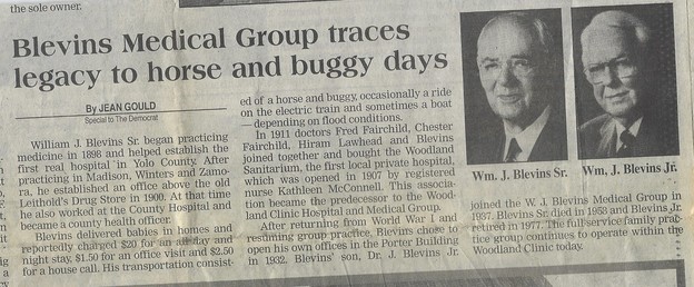 From the Daily Democrat, Thursday, March 30, 2000.  The Blevins Medical Group. (My saved Woodland Newspapers.)  Connecting the Blevins Home 618 First Street.